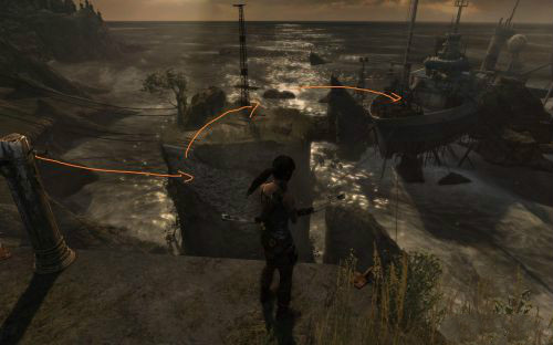 與他們聊天之后動身去找滑輪組,一直走就可以了,路線如下圖所示.跳進船內(nèi)后會有背對我們聊天的敵人,