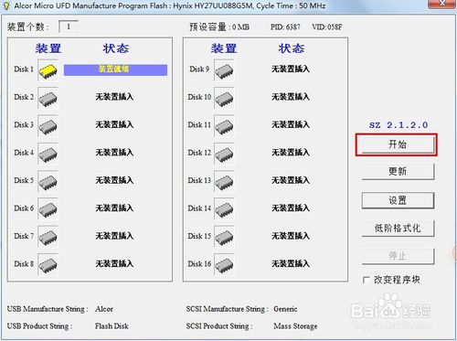 4.根據(jù)從U盤(pán)獲取的PID和VID信息,我們可以在百度中搜索下載相關(guān)U盤(pán)量產(chǎn)工具,如圖所示,點(diǎn)擊“開(kāi)始”按鈕。