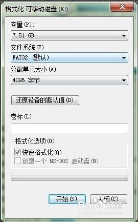 3.當(dāng)以上方法無(wú)法打開(kāi)U盤(pán)時(shí),建議對(duì)U盤(pán)進(jìn)行格式化操作。右擊“可移動(dòng)磁盤(pán)”,在彈出的右鍵菜單中選擇“格式化”項(xiàng)。在打開(kāi)的“格式化”窗口中,取消勾選“快速格式化”并點(diǎn)擊“開(kāi)始”按鈕。