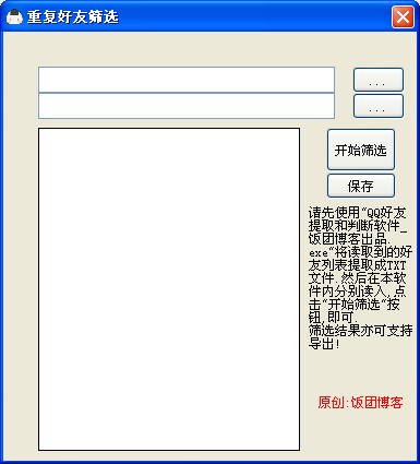 請先使用“QQ好友提取和判斷軟件”將讀取到的好友列表提取成TXT文件,然后在本軟件內(nèi)分別讀入,點擊“開始篩選”按鈕即可,篩選結(jié)果亦可支持導(dǎo)出。