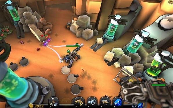 在游戲中玩家控制的機(jī)器人在自己的身上安裝防御武器,它的身上背著一個小簍筐,用來收集物品如(草莓、種子等),飛船主體可以用收集來的草莓生產(chǎn)出激光武器。機(jī)器人可將激光武器安裝于四周炮塔上。