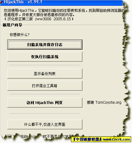 首頁綁架克星 - HijackThis,它能夠?qū)⒔壖苣鸀g覽器的程序揪出來!并且刪除之!或許您只是瀏覽某個(gè)網(wǎng)站、安裝了某個(gè)軟件,就發(fā)現(xiàn)瀏覽器設(shè)定已經(jīng)被綁架了,一般常見的綁架方式莫過于強(qiáng)制竄改您的瀏覽器首頁設(shè)定、搜尋頁設(shè)定,現(xiàn)在有了這個(gè)工具,可以將所有可疑的程序全抓出來,再讓您判斷哪個(gè)程序是肇禍者!把它給殺了!