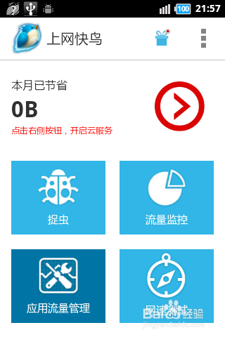 小編使用該應用的時候了解到,上網快鳥的云服務只能節(jié)省手機移動網絡環(huán)境下的流量,遇到WIFI環(huán)境會自動關閉?,F(xiàn)在開啟它的云服務功能,點擊“>”,或者在上網快鳥的“設置”菜單選擇“使用快鳥服務”,上網快鳥就可以在后臺運行監(jiān)控與節(jié)省流量的程序。