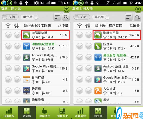 證明手機使用流量比較微小的時候,啟動上網快鳥反而損耗流量更大,下圖左側沒有啟動上網快鳥,用海豚瀏覽器訪問新浪頁面6次,流量消耗在255.9K;下圖右側使用上網快鳥,用海豚瀏覽器訪問新浪頁面6次,流量消耗在256.8K。當然,由于產生的是稀少流量,所以超出的那部分可以小到忽略。