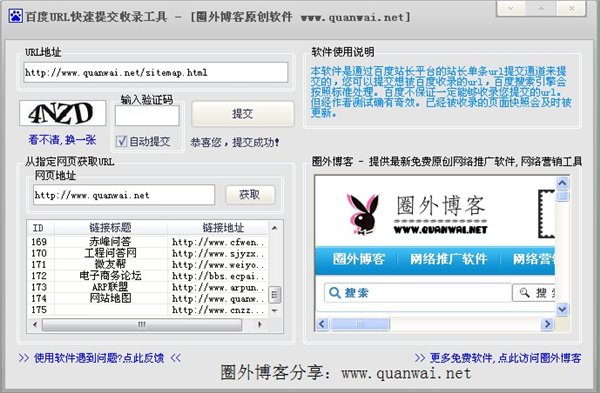 百度URL快速提交收錄工具 免費(fèi)版 百度URL快速提交收錄工具是通過百度站長平臺的站長單條url提交通道來提交的,由圈外博客站長卷卷原創(chuàng)開發(fā);您可以使用本工具提交想被百度收錄的url,百度搜索引擎會按照標(biāo)準(zhǔn)處理。百度不保證一定能夠收錄您提交的url。但經(jīng)卷卷測試確有奇效。已經(jīng)被收錄的頁面快照會及時(shí)被更新。