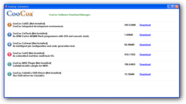 CoCenter是專門為CooCox系列軟件下載、安裝、升級和卸載而設(shè)計的一個軟件管理平臺,支持多任務(wù)運行和斷點續(xù)傳。用戶使用CoCenter升級CooCox軟件只需下載補丁包,不需再下載龐大的安裝包。