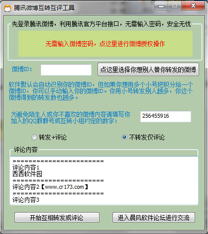 1.先點“無需輸入微博密碼,點這里進行微博授權(quán)操作”按鈕,在彈出的騰訊官方授權(quán)網(wǎng)頁中點“授權(quán)”之后就可以回到軟件主界面進行轉(zhuǎn)發(fā)和評論了。
