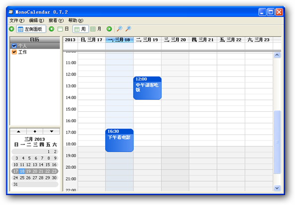 個人日程管理工具(monocalendar) V1.7.2 綠色版 monocalendar是一款挺酷的跨平臺的日程管理軟件,有中文版本。我打開界面,給人的感覺界面明亮,初看,覺得很像google 的日程管理,但是又有點蘋果風(fēng)格。這是我找了很久的軟件??梢园葱r安排自己的工作和生活,在時間表格上雙擊左鍵,就可以創(chuàng)建一個事件,輸入自己要干的事情后,就為自己安排了一個要做的事情了??梢酝ㄟ^拖動該事件框,把他移動到任何時間段??梢园慈眨粗?,按月,查看自己安排的事件。