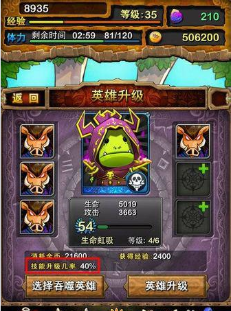 1、英雄升級(jí):英雄的升級(jí)是每款游戲中必不可少的一個(gè)東西,英雄不升級(jí)怎么可能越來(lái)越厲害呢,而在《我叫MT》中,給英雄升級(jí)是最重要的提高戰(zhàn)斗力的方法。 《我叫MT 》中的英雄升級(jí)需要進(jìn)行吞噬其他的英雄,同時(shí)需要耗費(fèi)一定的金錢。等級(jí)越高,折合的經(jīng)驗(yàn)越多。另外需要注意的是,英雄除了自己的等級(jí),還需要提升技能等級(jí)而達(dá)到更好的效果。而技能提升則需要吞噬擁有同樣技能的英雄(所以在吞噬英雄的時(shí)候,最好看好技能,對(duì)應(yīng)技能的英雄進(jìn)行吞噬,這樣能夠事半功倍)。