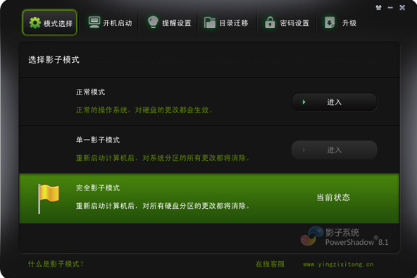 與單一影子模式比較,完全影子模式將會對本機內(nèi)所有硬盤分區(qū)創(chuàng)建影子。當(dāng)退出完全影子模式時,任何對本機內(nèi)硬盤分區(qū)的更改將會消失。在完全影子模式下,可以將有用的文件儲存至閃存或者移動磁盤內(nèi)。