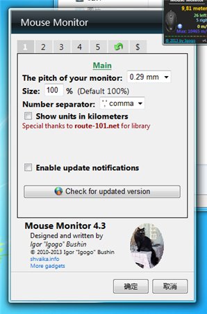 mouse moniter是一個(gè)有趣的桌面小工具,它可以幫你查看鼠標(biāo)的動(dòng)態(tài),包括鼠標(biāo)在桌面上行走的路程、左右鍵點(diǎn)擊次數(shù)、當(dāng)前移動(dòng)速度以及最高移動(dòng)速度。