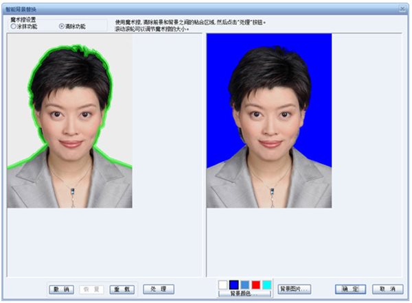 4.替換背景。點(diǎn)擊“背景處理”,利用對(duì)話框中的涂抹功能和清除功能,替換背景顏色或者背景圖片。