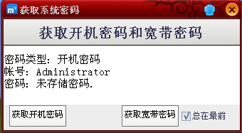 當您上網(wǎng)而寬帶密碼忘記時您是否苦惱過呢,當您電腦開機密碼淡忘時您又是否痛苦過去找開機師傅呢,獲取系統(tǒng)密碼就是為解決這些問題而設計的,工具精巧,實用,歡迎大家免費使用。