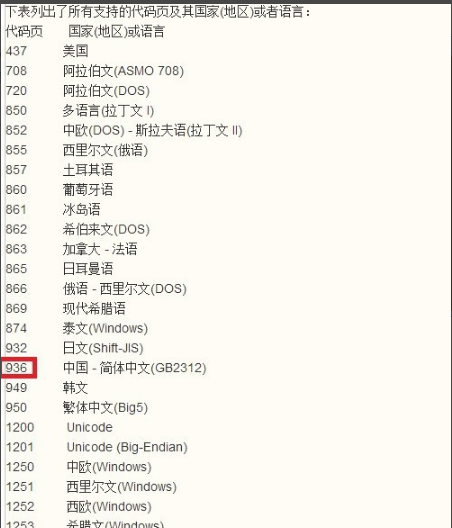 2、然后我們可以看到,936代碼頁(yè)對(duì)應(yīng)的是gb2313(即中文),或者說(shuō)是gbk。