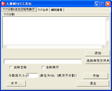 大傻師TXT工具包,支持txt分割,合并,編碼查看,去除txt文本空格與換行。 特色:大傻師TXT工具包界面簡(jiǎn)單,操作易行,很方便,推薦給大家。