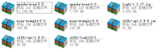 apache-mina-2.0.7-bin.zip,apache-mina-2.0.7-src.zip,log4j-1.2.17.zip,slf4j-api-1.6.6.jar,slf4j-api-1.6.6-sources.jar,slf4j-log4j12-1.6.6.jar,mina-example-2.0.7.jar,mina-example-2.0.7-sources.jar。涉及mina開發(fā)相關(guān)的基本上都在這里了。