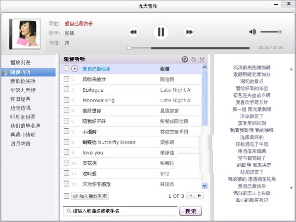 九天音樂電腦版匯集了從上個世紀(jì)70年代至今的各個時期的知名歌手的專集以及時尚流行的音樂形式,海量音樂、時尚資訊、MTV、排行榜、圖庫豐富全面應(yīng)有盡有。