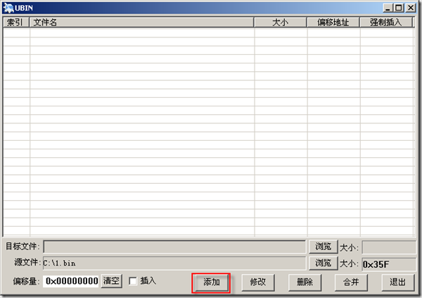 首先,添加第一個(gè)文件1.bin,其地址為0x0000,所以,偏移量設(shè)置為0x00000000,設(shè)置完偏移量后點(diǎn)擊“添加”按鈕。