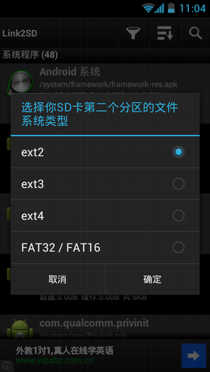 3、打開(kāi)Link2sd,彈出選擇第二分區(qū)的類(lèi)型對(duì)話框,按照你分區(qū)的類(lèi)型的選擇即可,如果不行就算是分區(qū)是EXT3 4 試一下選EXT2。如下圖: