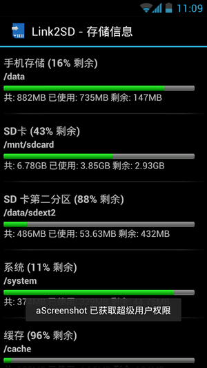 4、重啟手機(jī)后打開(kāi)link2sd,菜單鍵 ->存儲(chǔ)信息 ->查看是否掛載成功與各分區(qū)使用情況,如下圖: