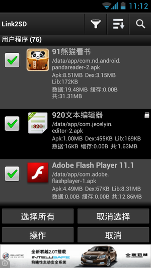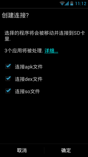6、手機(jī)菜單鍵 ->多選 ->選擇需要移動(dòng)到ext分區(qū)的軟件 ->選擇好后:點(diǎn) 操作 按鈕 ->創(chuàng)建連接 ->確定,過(guò)程如下圖: