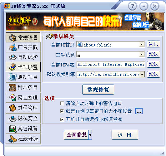 現(xiàn)在瀏覽網(wǎng)頁,經(jīng)常很容易被一些網(wǎng)站惡意修改瀏覽器的首頁,修改IE的標(biāo)題顯示,有的還會在IE的右鍵菜單中添加一些項目,還有的會在IE的工具欄添加一些按鈕,更有甚者還會讓你無法修改IE的首頁,其實這些都是某些網(wǎng)頁的惡意代碼所為,但卻我們帶來了極大的不便?,F(xiàn)在有了IE修復(fù)專家,就再也不用怕這些麻煩了!