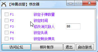 神勇戰(zhàn)警修改器可以將彈夾數(shù)鎖定,將丹藥2鎖定,將時(shí)間鎖定,還可以修改消滅敵人人數(shù)等功能。