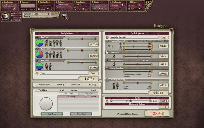 言簡意賅:對于新手來說,不用打開貿(mào)易窗口,亂改里面的選項后果又時很嚴重(例如有次我大規(guī)模囤積坦克,導(dǎo)致日收入瞬間變?yōu)?14K,注意是K),另外在貿(mào)易窗口有一個很細微的小選項可以決定國民可不可以直接從國庫買東西,推薦打上勾。而對于稅收和開支部分,只能奉勸大家在政治不夠明文的時候多多攢錢,否則一旦都后期政策一到位,養(yǎng)老金、失業(yè)保障什么亂七八糟一擁而至,國庫真的承擔(dān)不起,沒有存夠20M(注意是M)的資金不要跟英國大媽開戰(zhàn),因為你也不知道要打到何年何月。