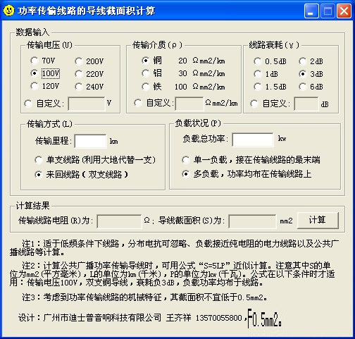 傳輸導線截面計算軟件是一款定壓公共廣播截面計算軟件,可以根據(jù)傳輸電壓,介質、線路衰耗、傳輸里程、負載總功率等來計算出線路的電阻和導線截面積。
