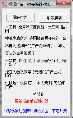 悲傷視頻廣告一鍵去除器工具能夠清除屏蔽優(yōu)酷,土豆網(wǎng),酷6網(wǎng),搜狐高清奇藝等網(wǎng)站視頻開頭的廣告,不再為這麻煩的廣告而煩惱了,可以爽快的去看視頻了。一次使用終生受用 從此看視頻不用看廣告了。