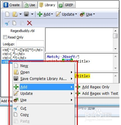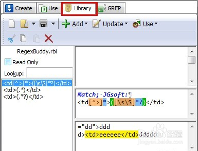 使用Libray庫(kù)文件。測(cè)試好了正則表達(dá)式后,你可以把他添加到自定義庫(kù)里,并保存本地硬盤(pán)。這樣下次你可以直接調(diào)用出來(lái)修改。通過(guò)Libray按鈕,你可以切換到該面板。你首先要把選中Read Only去掉,才編輯該庫(kù)文件,如下圖所示: