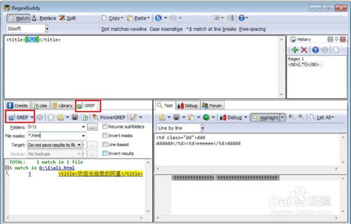 Dot matches newline:是否允許 . 匹配任何字符包括分隔符。Case insensitive:是否不區(qū)分大小寫(xiě)。選中后,測(cè)試效果如下:輸入的是大寫(xiě)的TITLE,以及多行顯示都可以匹配出來(lái),如下圖所示:
