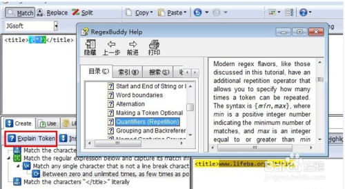 點(diǎn)擊 Explain Token按鈕,指向的正是你所選擇的節(jié)點(diǎn)的正則表達(dá)式的語(yǔ)法規(guī)則的解釋?zhuān)缦聢D所示:<br style="font-family: