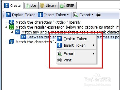 點(diǎn)擊 Insert Token按鈕會(huì)彈出一個(gè)下拉菜單,其中包含了正則表達(dá)式里涉及的所有語(yǔ)法符號(hào),可以進(jìn)行選擇,當(dāng)然對(duì)于語(yǔ)法十分熟悉后,就可以不用這個(gè)菜單,直接在上面的文本輸入?yún)^(qū)鍵入表達(dá)式了,如下圖所示: