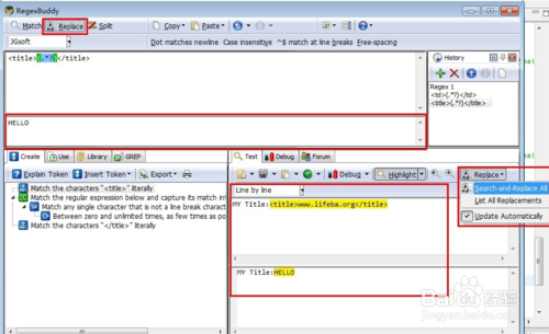 上面的界面是再M(fèi)atch模式下的介紹;如果點(diǎn)擊上面的Replace按鈕,顯示的面板會(huì)由稍微的不同。下面的界面顯示了,對(duì)匹配到的正則內(nèi)容,替換為HELLO的效果,如下圖所示: