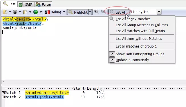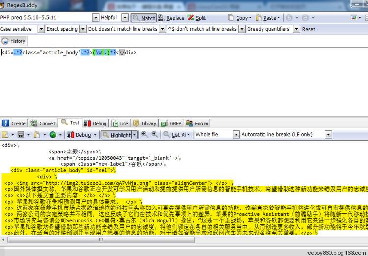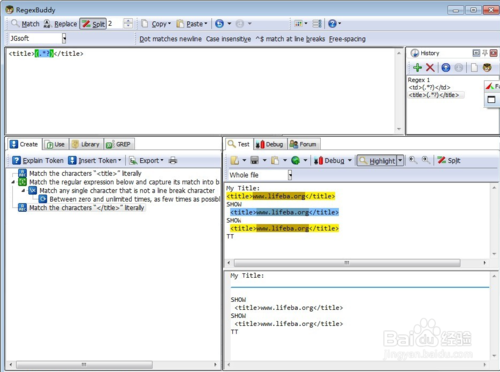 <打開(kāi)RegexBuddy后默認(rèn)載入的是上一次你所測(cè)試的正則信息,選項(xiàng)配置信息都會(huì)自動(dòng)載入上次你所設(shè)置的內(nèi)容。歷史記錄中顯示的是你所測(cè)試過(guò)得正則信息。1、測(cè)試正則表達(dá)式。、在正則表達(dá)式輸入需要測(cè)試的正則,如:??梢酝ㄟ^(guò)上面的面板選擇語(yǔ)言,默認(rèn)是JGosft,可以指定JAVA,Python等。<br b、測(cè)試文本面板(Test標(biāo)簽)輸入需要測(cè)試的文本內(nèi)容,如:??梢赃x擇Line By Line、Whole File、Page By Page,來(lái)指定是每行抽取,還是對(duì)整個(gè)文檔抓取等(如果你的正則匹配信息有包含多行內(nèi)容,務(wù)必要選中Whole File或者Page By Page)。測(cè)試文本面板會(huì)根據(jù)正則表達(dá)式和測(cè)試內(nèi)容,實(shí)時(shí)顯示匹配到的高亮預(yù)覽信息。如:上圖中的,全部高亮,如果你選中了HighLight下得HighLight Group1選項(xiàng),還會(huì)實(shí)時(shí)顯示抽取出來(lái)的內(nèi)容:www.lifeba.org。上面2個(gè)部分用不同的顏色模塊顯示區(qū)分。當(dāng)然你也可以不選擇預(yù)覽。c、輸出結(jié)果面板,顯示的顯示了正則表達(dá)式的匹配結(jié)果。你可以通過(guò)List All切換顯示的效果,如下圖所示:
