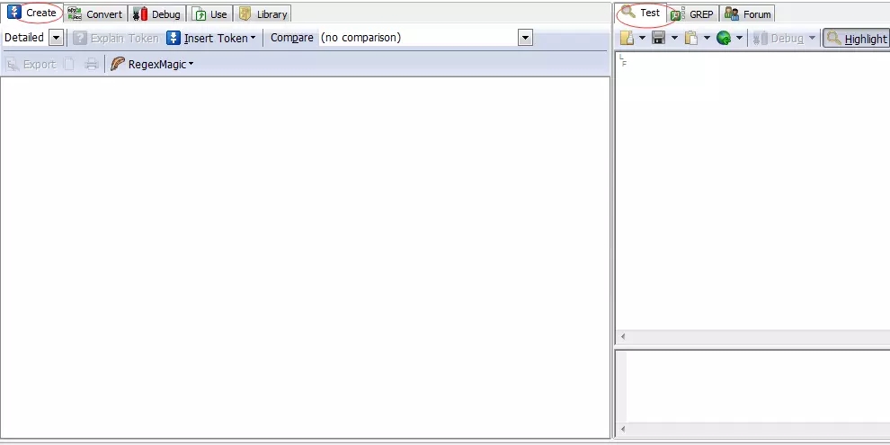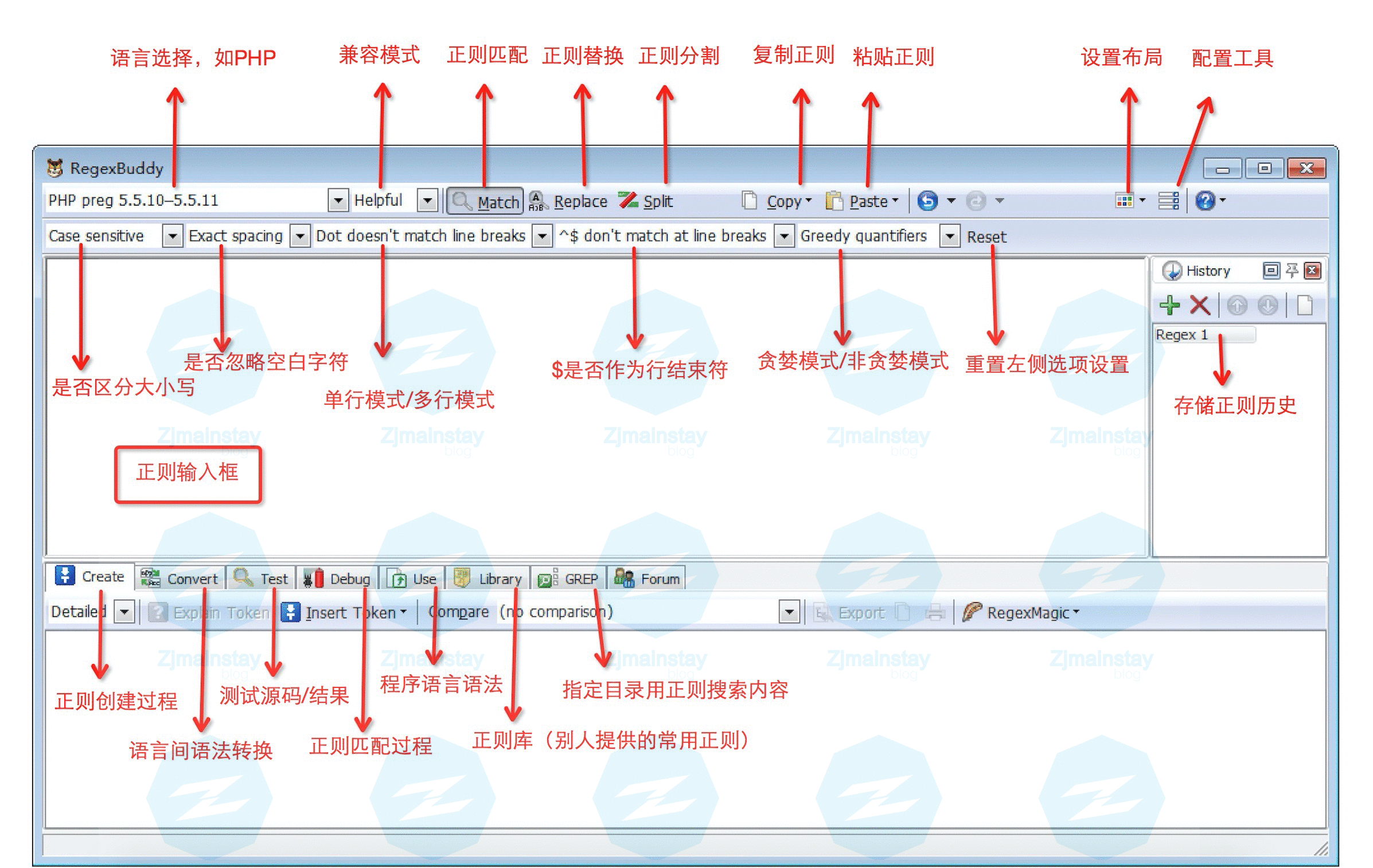 界面主要包括:正則表達(dá)式、測(cè)試文本、輸出結(jié)果、歷史記錄、Create相關(guān)面板,如下圖所示: