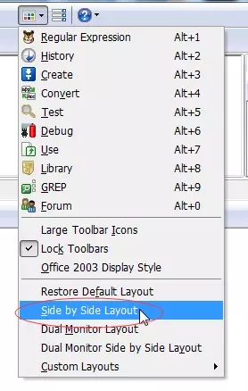 如何使用regexbuddy切換布局?點(diǎn)擊右上角的彩色格子圖標(biāo),選擇 Side by Side Layout: