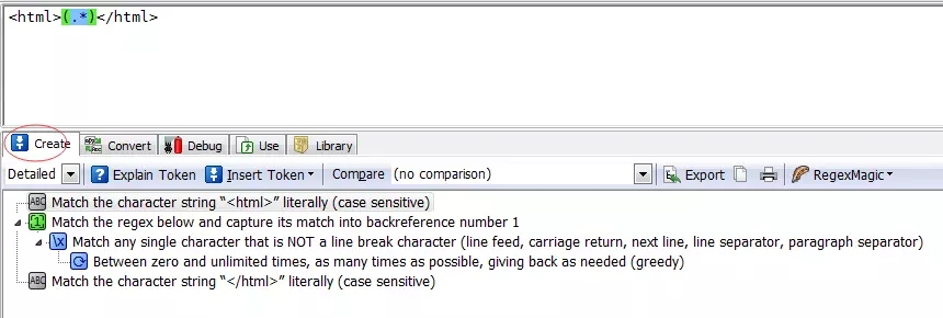 Create面板。對(duì)這個(gè)正則表達(dá)式的解釋的一個(gè)樹(shù)狀展示,其中的每一個(gè)節(jié)點(diǎn)對(duì)照著表達(dá)式中的一個(gè)元素塊,在RegexBuddy中被稱(chēng)為一個(gè)“token”,我們點(diǎn)擊其中的一個(gè)節(jié)點(diǎn),就會(huì)在我們所輸入的表達(dá)式的相應(yīng)部分進(jìn)行著重顯示。在分析他人所寫(xiě)的復(fù)雜的表達(dá)式的時(shí)候在這里查看會(huì)十分方便,如下圖所示: