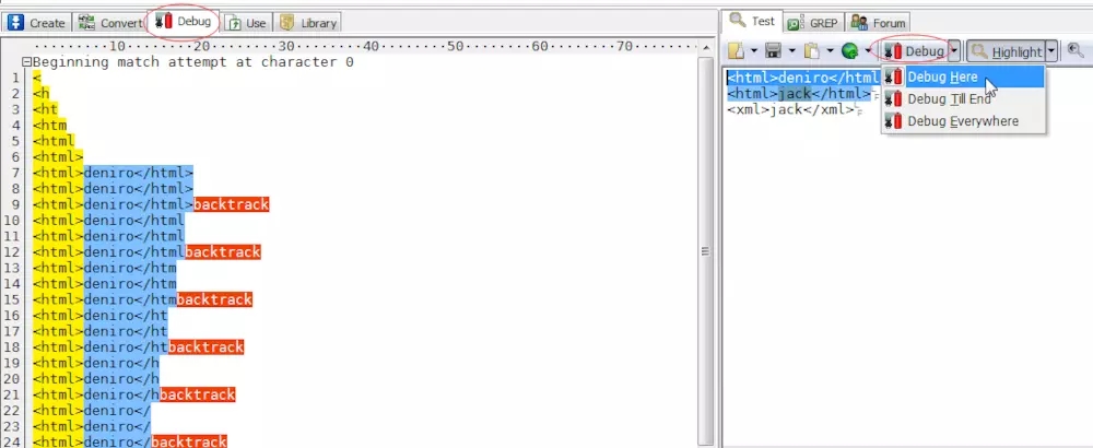 在 Test 面板選定一行測(cè)試文本,然后選擇 Debug 下拉中的 Debug Here,就可以看到這一行測(cè)試文本的正則匹配過(guò)程啦: