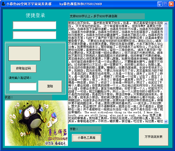 暮色漸藍(lán)制作的QQ空間萬字說說發(fā)表器是一款提供QQ空間超長說說發(fā)表的軟件,經(jīng)測試,9200字以下的說說能夠正常發(fā)表,多余9200字請大家自測,最新版完全解決了360誤報(bào)的問題,安全無毒,歡迎大家下載體驗(yàn)。