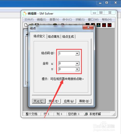 點(diǎn)擊結(jié)點(diǎn)按鈕進(jìn)行結(jié)點(diǎn)輸入。根據(jù)提示進(jìn)行坐標(biāo)輸入,也可以直接在顯示界面用鼠標(biāo)直接拾取位置。我們可以看到在輸入數(shù)據(jù)后在操作界面和顯示界面都有不同形式的顯示。
