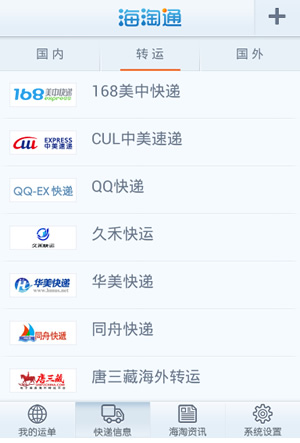 支持轉(zhuǎn)運快遞有:百通、飛洋、華美、CUL、風(fēng)雷、天翼、同舟、先鋒、量子、DCS、TWC、海星橋、久禾等近30家轉(zhuǎn)運公司。
