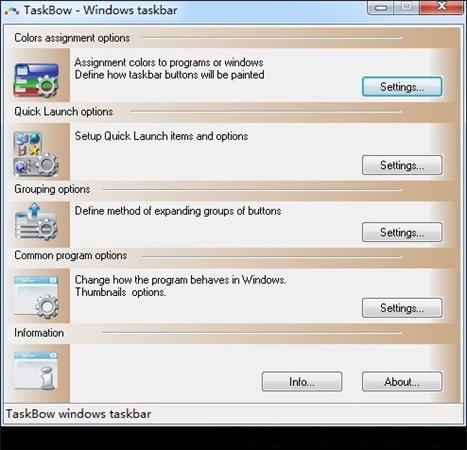 TaskBow是一跨幫助用戶進(jìn)行自定義任務(wù)欄功能的工具,在自定義任務(wù)欄工具的幫助下,用戶可以按照自己的使用習(xí)慣和審美來自定義windows任務(wù)欄的樣式顏色,排列方式等.