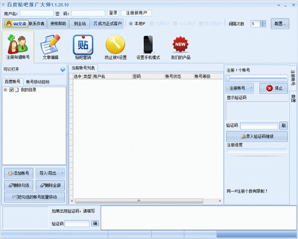 百度貼吧推廣大師是一款集百度帳號(hào)注冊(cè)、帳號(hào)激活、批量管理、文章偽原創(chuàng)、百度貼吧喜歡、升等級(jí)、批量提問、批量回答等不同功能,為一體的超強(qiáng)推廣工具。
