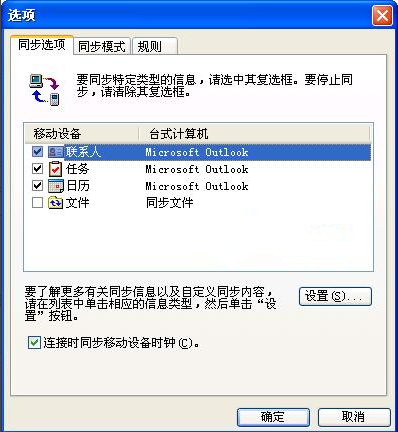 在這個(gè)選項(xiàng)中第一個(gè)面板“同步選項(xiàng)”最為有用,在這里用戶可以選擇手機(jī)和PC進(jìn)行同步的文件類型,其中包括“聯(lián)系人”、“任務(wù)”、“日歷”、“文件”。需要同步的文件類型進(jìn)行勾選。