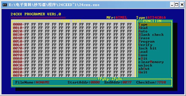 24CXX PROGRAMER VER1.0常用命令:Type、Read、Auto、Blank check、Erase、Program、Verify、Lock bit、Load、Save、eDit、clearMemory、unlock、abOut、Quit。