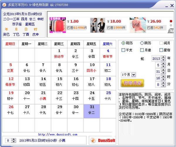 多姿萬年歷 v3.9.0.0 綠色版 多姿萬年歷包括陽歷、陰歷、閏年、閏月、各種節(jié)日、節(jié)氣、天干地支、屬相、星座、星期、傳統(tǒng)黃道吉日(黃色)和28星宿的顯示,每日宜忌提示以及打印月歷等。從本版本多姿萬年歷開始支持月歷的打印了,分別可以按1,2,4,6,8,10,12個(gè)月進(jìn)行打印。公元記年:0100年-9999年;陰歷記年:1881年-2060年;干支記年:1901年-2048年。