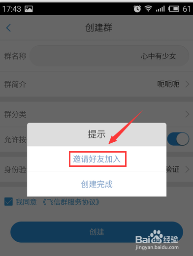 然后輸入我們的群的名字等等信息,然后點(diǎn)擊最下方的『創(chuàng)建』,如圖示。