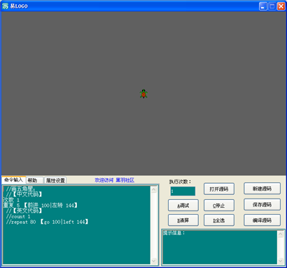 (支持中英文輸入)前進(jìn)(go) 后退(back) 左轉(zhuǎn)(left) 右轉(zhuǎn)(right) 畫圓(circle) 重復(fù)(repeat) 回家(home) 清屏(cls) 停止(stop) 次數(shù)(count) 抬筆(lift) 落筆(fall) 延時(sleep)